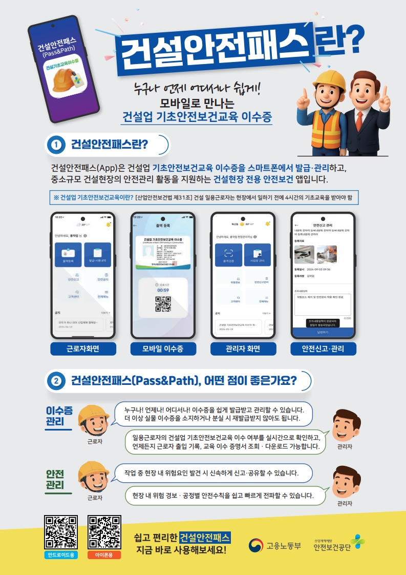[안전보건공단] 건설업 기초안전보건교육 이수증 모바일 앱(건설안전패스)