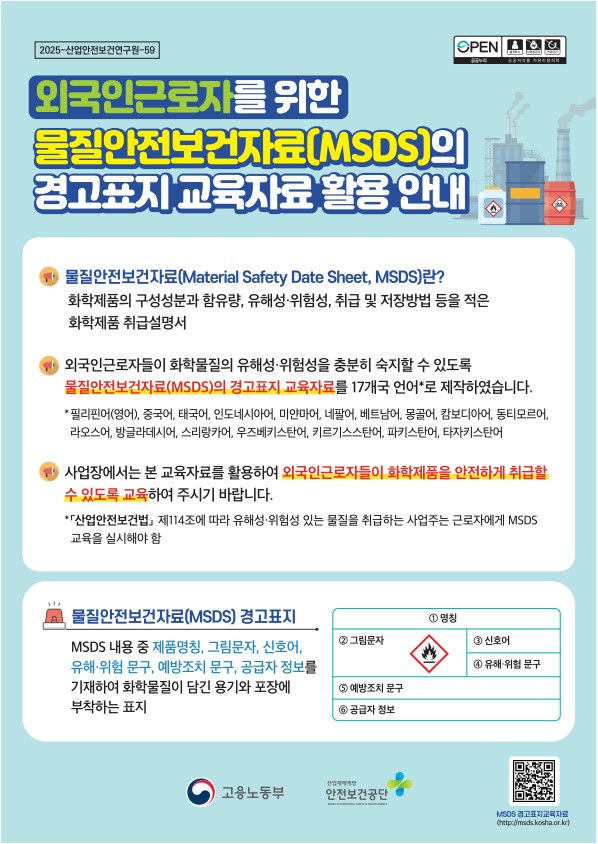 [안전보건공단] 외국인근로자를 위한 물질안전보건자료(MSDS)의 경고표지 교육자료 활용 안내