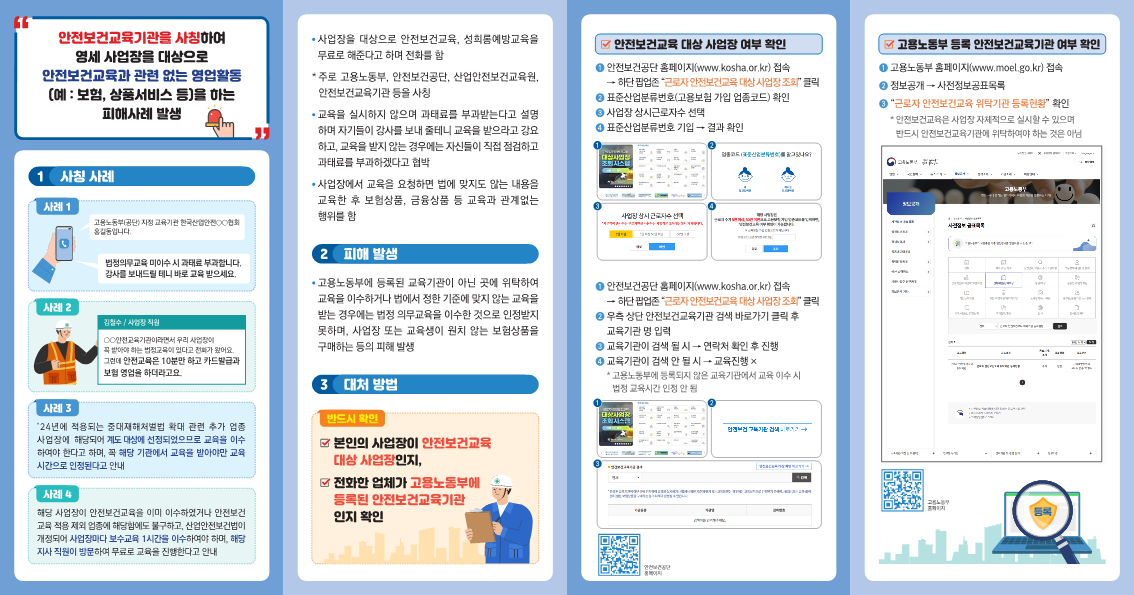안전보건교육기관을 사칭하여 교육과 관련 없는 영업(보험 등) 활동을 하는 피해 사례가 발생하고 있습니다.